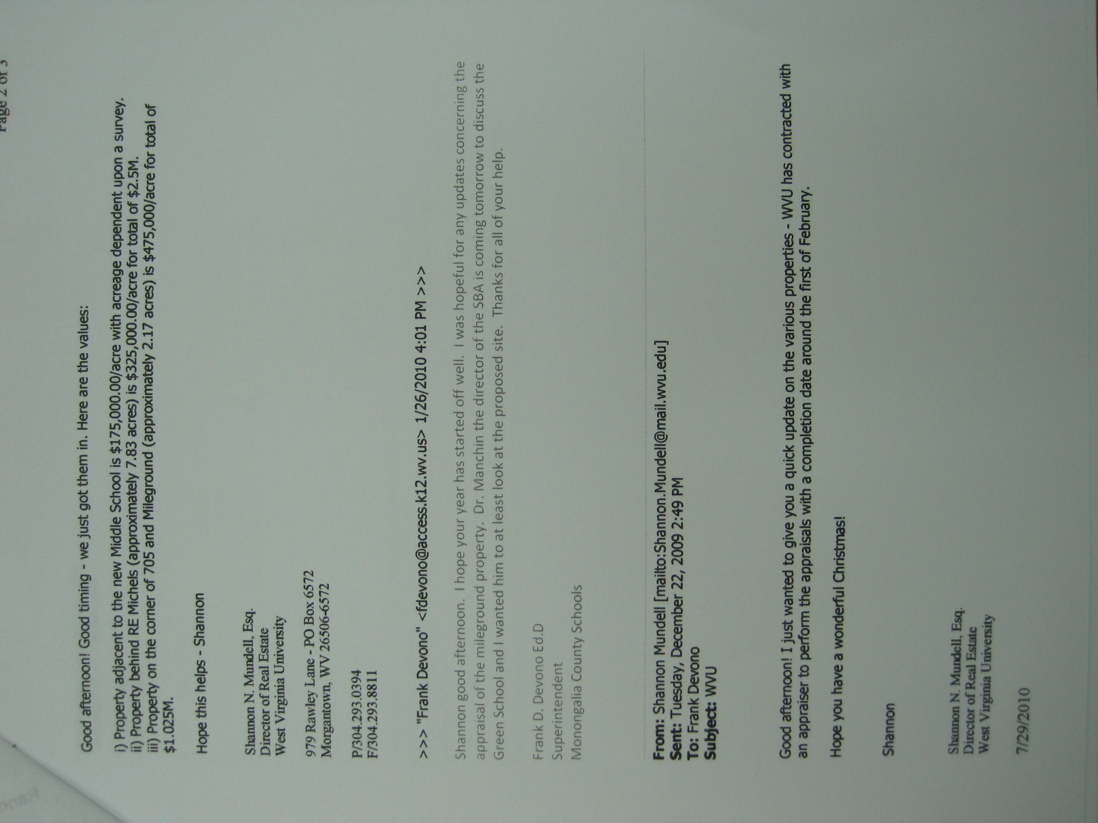 Second, by FOIA we know that months earlier, by February 3rd, Mon Schools had an appraisal for the Mileground site. Why did it not appraise the MM/UHS site?