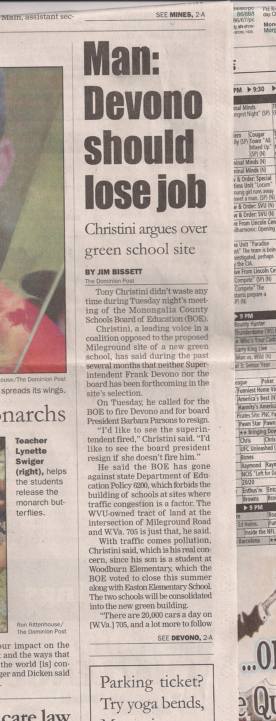 A good article by the Dominion Post with an odd title, “Man: Devono should lose job: Christini argues over green school site”. “Man”? Why not, “Parent”?