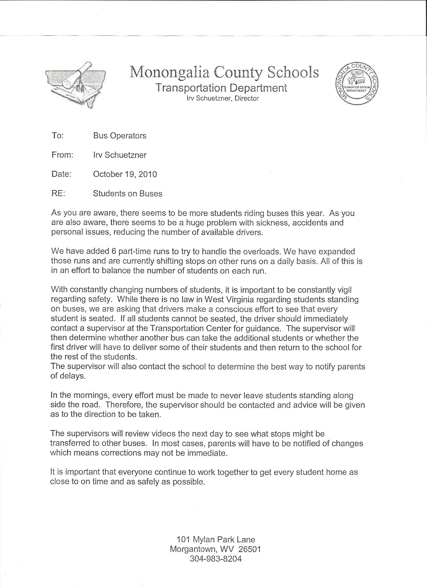 This comes less than a month after the Director wrote a September 22 memo making standing on buses acceptable, which violates several Mon Schools Policy and Procedure statutes.