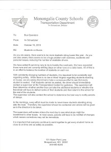 Below, despite its strange first paragraph, is an October 19 memo from Mon Schools Director of Transportation that shows pressure and publicity can work. Mon Schools was forced to totally reverse course, retract its policy violation, and put in writing that no students may stand on buses.