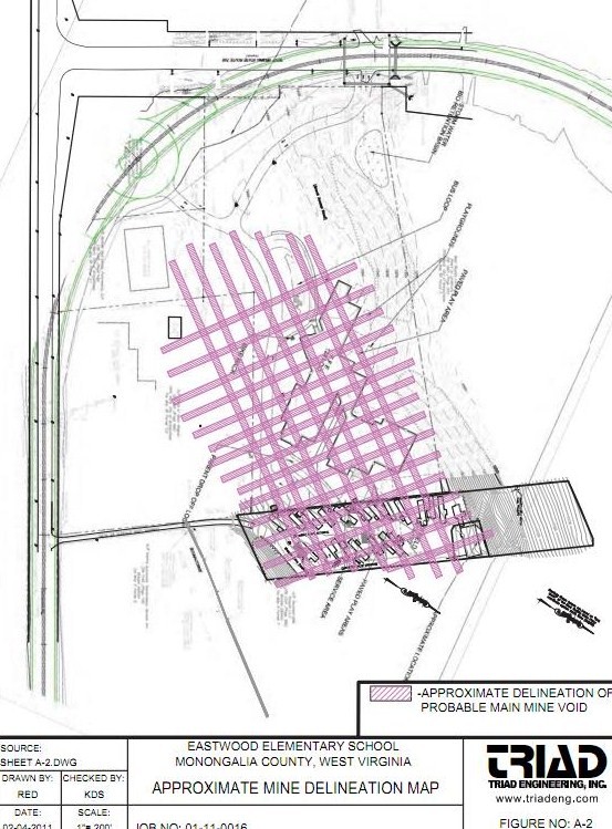 Triad Engineering shows that the mines all interconnect (figure A-2) (see below) under virtually the entire Eastwood grounds. Once the mine voids are filled, the water and sewage displaced, would any nature trail then traverse a sewage seep? What test has yet been conducted for sewage seep? Apparently the new school would be heated and cooled by the temperature of the trailer park sewage radiating through the geothermal pipes into the classrooms. Now that’s what we call brownfield development!