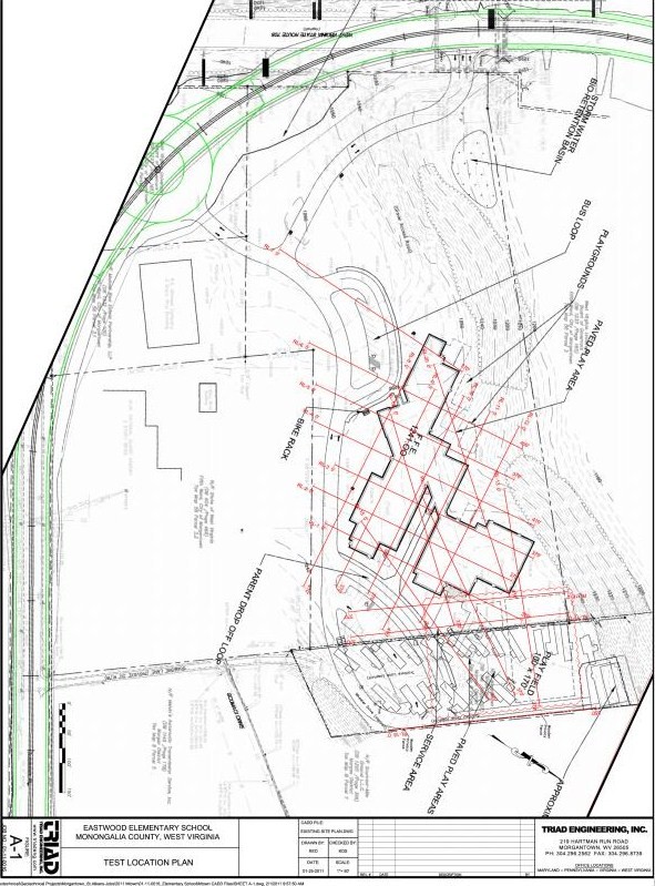 This is an intended acquisition of Eastwood school grounds that has never been publicly discussed, to our knowledge, let alone approved by any agency. We discovered this information subsequent to inspecting the Mon Schools link to the Eastwood architects’ website (Williamson Shriver), wherein one finds a “Report of Geophysical Study” by Triad Engineering claiming that the trailer park portion already “has been purchased [by Mon Schools] to accommodate the scope of the [Eastwood] project.” It has not been purchased. Further, the Eastwood architect (Williamson Shriver) notes in the February “Design Development Educational Specification” that the Eastwood site “tract” consists of 11.3 acres, well above the 8.85 acres purchased from WVU and previously known to the public. Thus, Mon Schools continues to operate very quietly with minimal public awareness, let alone involvement, and continues schematically designing part of the State SBA-funded facility on land that Mon Schools does not own. The Petitioner knows of no documentation expressing intent to either sell or purchase the extra acreage, and yet the schematic design wholly encompasses it (see below). Again, such procedure is forbidden by State SBA contract, Section 8.