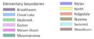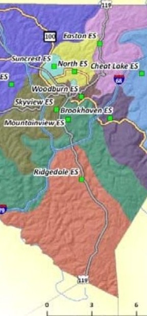 Notice that Easton Elementary is misplaced on the catchment map (above/below). In reality, Easton school sits a couple miles south of its mapped location, below the “a” in “Cheat,” exactly where US 119 forms a sharp elbow (within that elbow, or nub on the map). However, the map falsely yet curiously places Easton Elementary at the spot of the new University High School campus, which, with its 94 acres, would provide plenty of free land upon which to build a highly accessible new elementary school to replace the grossly inadequate existing Easton school.