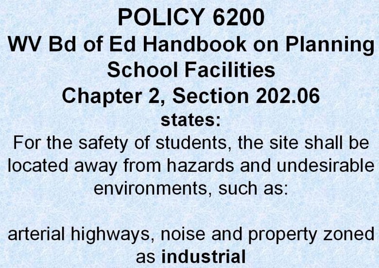 Kenna Elementary in Kenna, Jackson County, is threatened with being relocated into an industrial park in violation of WV BOE Policy 6200. Will the WV School Building Authority fund this violation too, health and safety of the students be damned? (Update: the SBA did indeed award funding in June 2011.)
