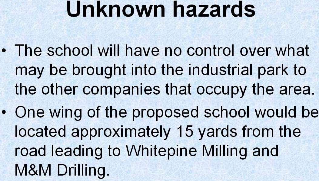 Policy 6200 has been quoted many times on this website. The locations listed as prohibited for school sites are to guarantee safety for our children. Jackson County Board member Carroll Staats states, “Once it’s there, everyone will be pleased.” If the school is eventually built at that site, parents will see some of the safety issues that should have been addressed before the property was purchased in 2006.
