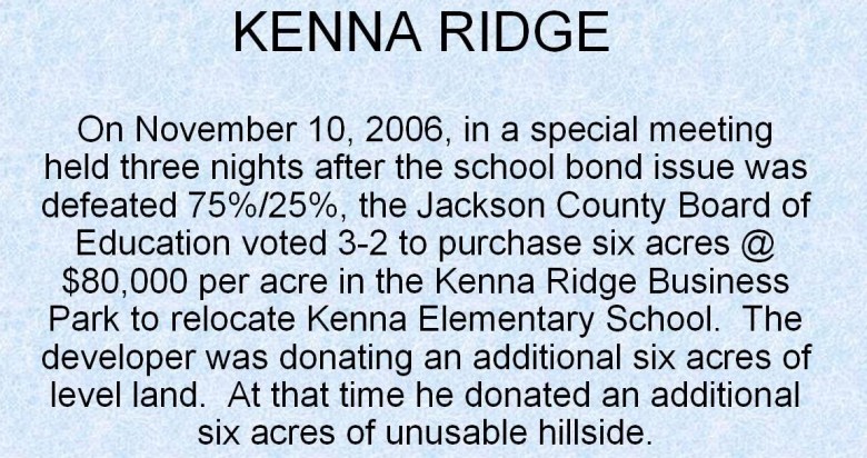 On June 27, 2011 the West Virginia School Building Authority officially announced the granting of $8.7m in funding to the Jackson County Board of Education to aid in construction of a new Kenna Elementary School. The site for the school is in the Kenna Ridge Industrial Park. Jackson County Board President, Tom Layne, has asked me “to get on board to support the school at this location”. The site is an industrial park and does not meet the criteria of WVBOE Policy 6200, Section 202.06 regarding school building sites. We are opposed to the site because of obvious safety issues. Getting the funding does not change the safety issues! Board member Jack Wiseman was quoted in Saturday’s Jackson Star Herald Weekender as saying “it will be a safe school”. Maybe it would be a safe school building but it would not be in a safe location.