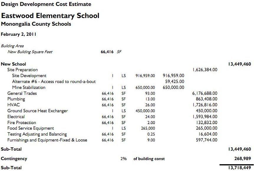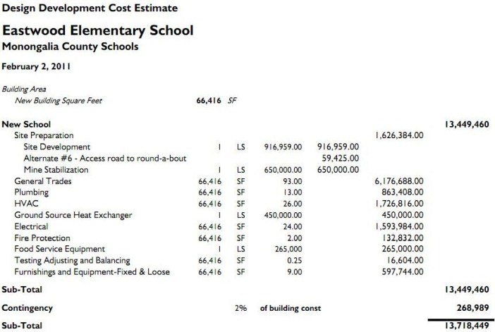 [Update: On April 15, 2012, the Dominion Post reported that Mon Schools’ architect upped the estimated cost of Eastwood by $2.5 million to $17.6 million, which we had long since anticipated and explained. Add in the approximately $4 million in land acquisition and other costs, and the overall cost of Eastwood surpasses $21,000,000, which again we have long since estimated (see below), and which is a cost far, far higher than has ever been previously admitted or in any way put forth as even a possibility by the officials. And again, for reasons we have long since explained, the total costs could go far, far higher, if they haven’t already.]