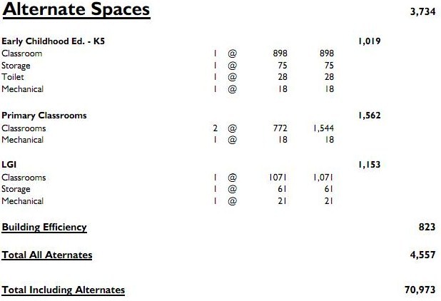 - THE SCHEMATICALLY DESIGNED “FINAL” PART OF THE FULL-SIZED SCHOOL (DETAILED BELOW AS “ALTERNATE SPACES”), WHICH WOULD TAKE THE STUDENT SEATING CAPACITY OF EASTWOOD FROM 450 TO 550 AND THE SQUARE FEET OF THE SCHOOL FROM 66,416 TO 70,973: ???~$2,000,000