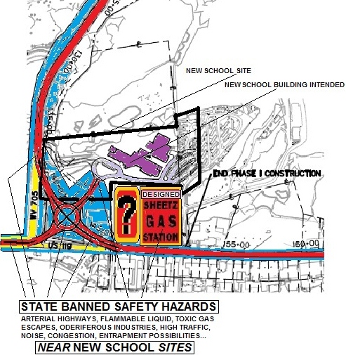 5. Lethal threat and violation 4: gas stations and vehicle repair shops increase the leukemia rate by 400% – in children living nearby, according to studies; Mileground commerce consists mainly of these disease-inducing vehicle repair shops and gas stations, including at least half a dozen vehicle repair shops within a few hundred meters of the site, and three gas stations also within a few hundred meters of the site, making an impending, school-site-bordering Sheetz gas station the fourth. This large gas station is schematically designed to be located immediately adjacent to the school site, close to the school building, likely sharing a school drive.